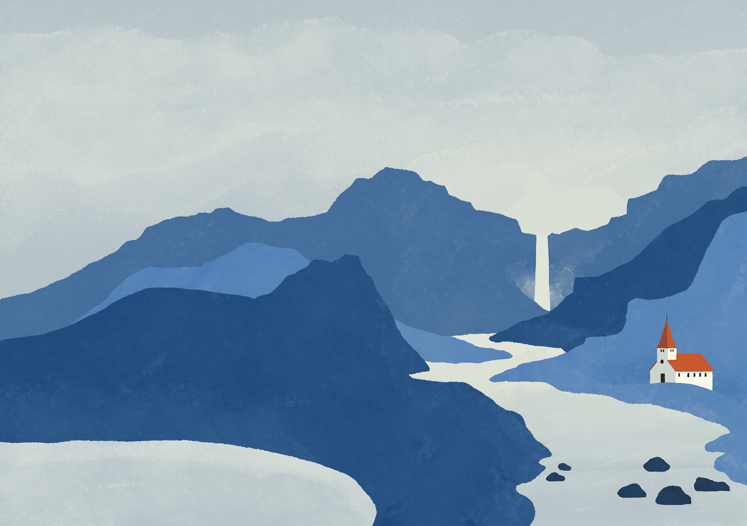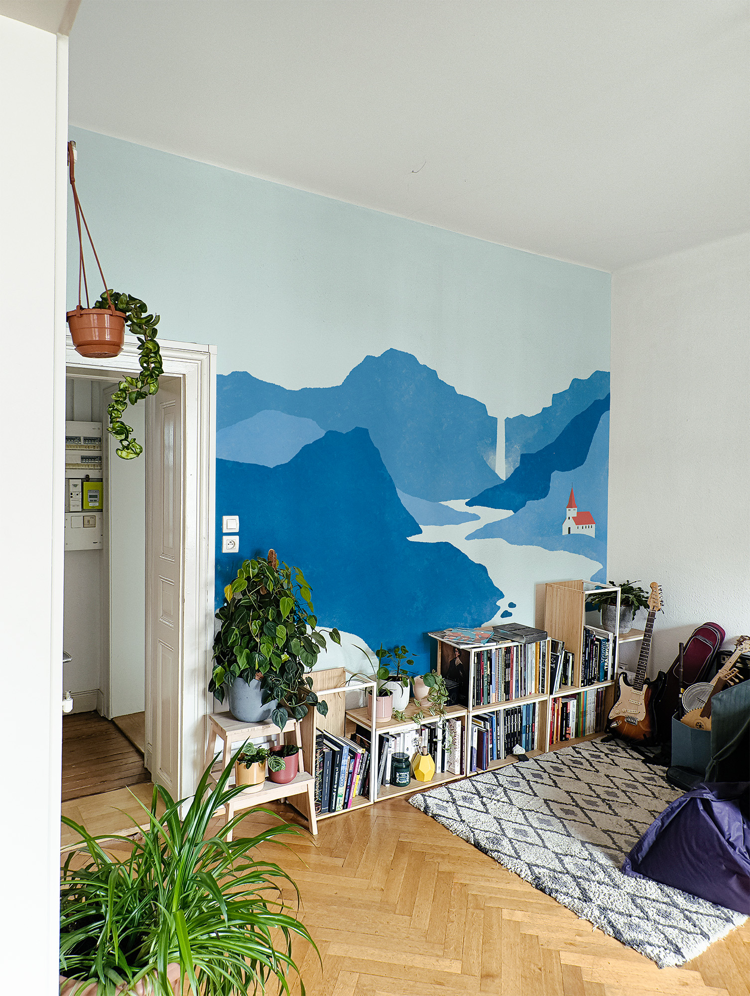Projet personnel d’illustration sur Procreate d’un paysage islandais, et mise en situation type fresque murale.